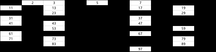 // [2, 3, 5, 7, 11, 13, 17, 19, 23, 29, 31, 37, 41, 43, 47, 53, 59, 61, 67, 71, 73, 79, 83, 89, 97]