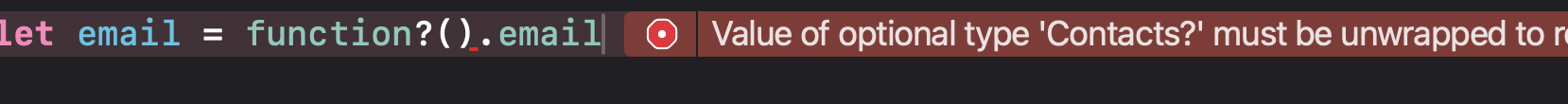 // error: Optional Chaining.xcplaygroundpage:20:1: error: value of optional type 'Person?' must be unwrapped to refer to member 'contacts' of wrapped base type 'Person'