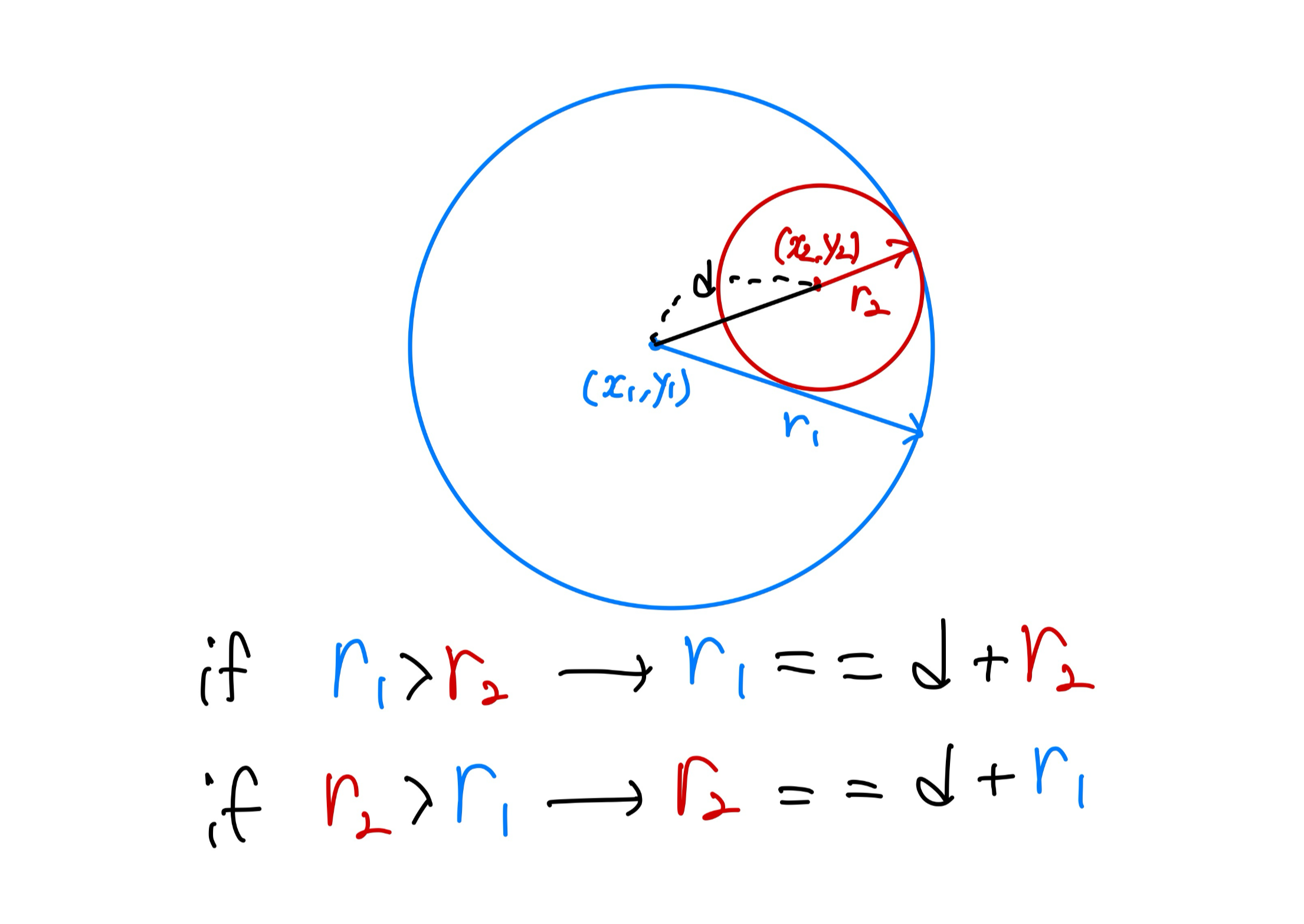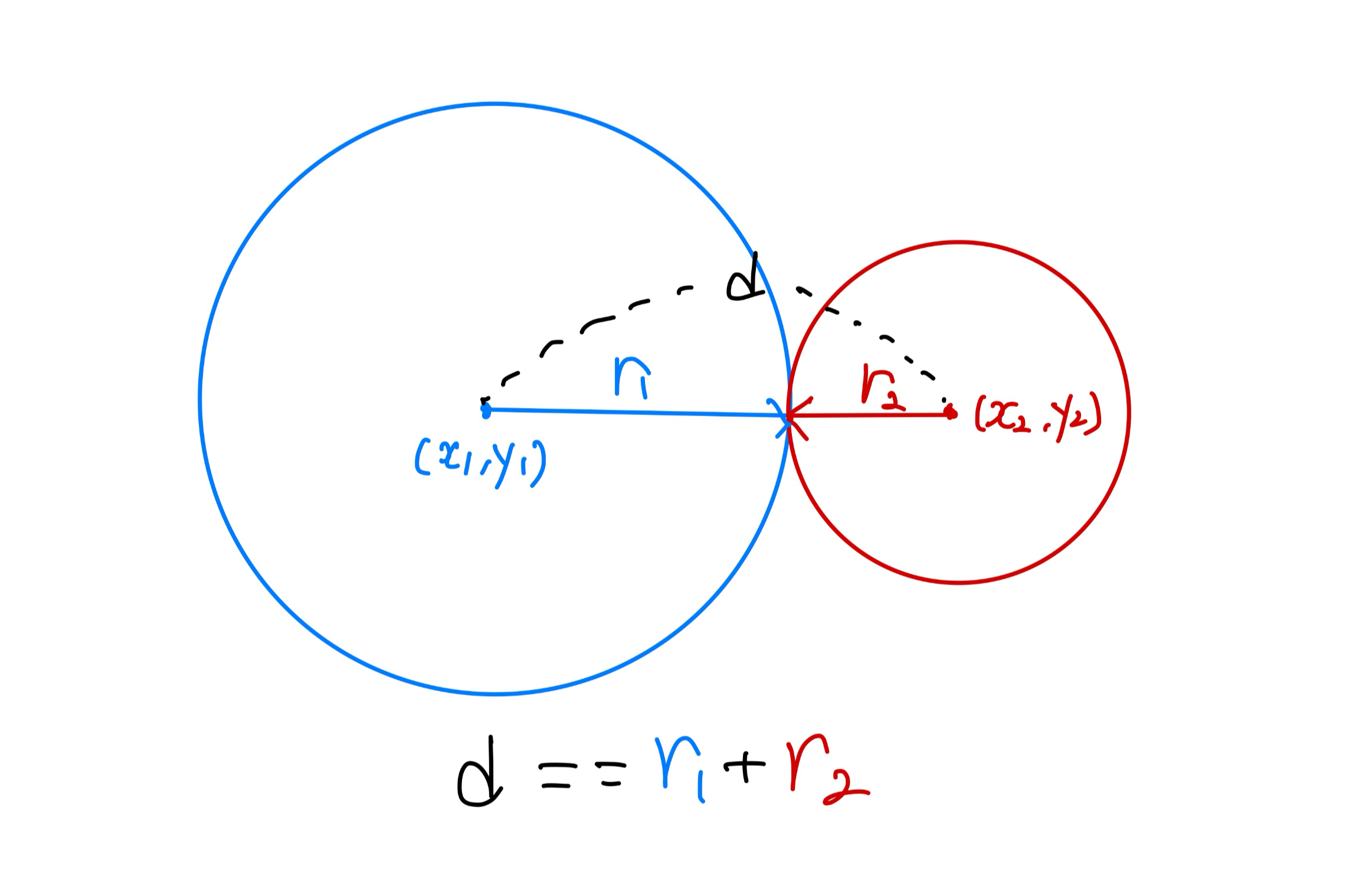 만약 두 점사이의 거리가 r1 + r2의 값보다 크면 재명이가 존재할 수가 없음!!