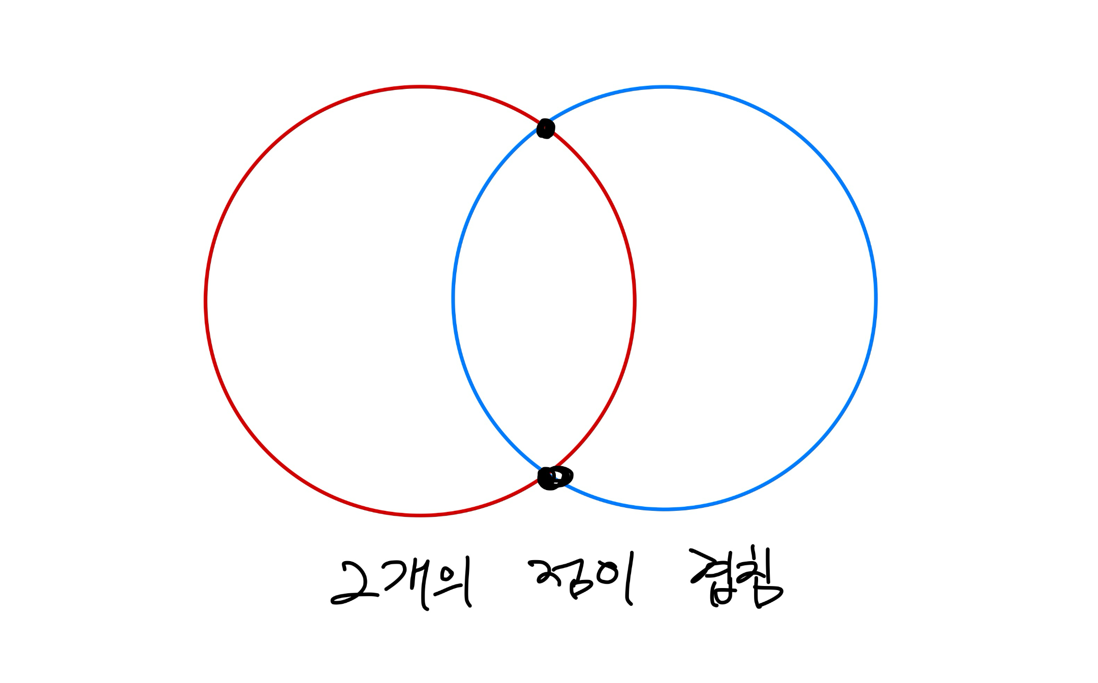 만약 두 원이 겹치면 만나는 점이 2개가 생김, 재명이가 있을 수 있는 위치가 2개가 존재