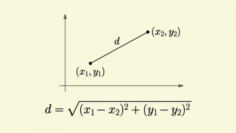 var d = sqrt(pow((x1 - x2), 2) + pow((y1 - y2), 2))
