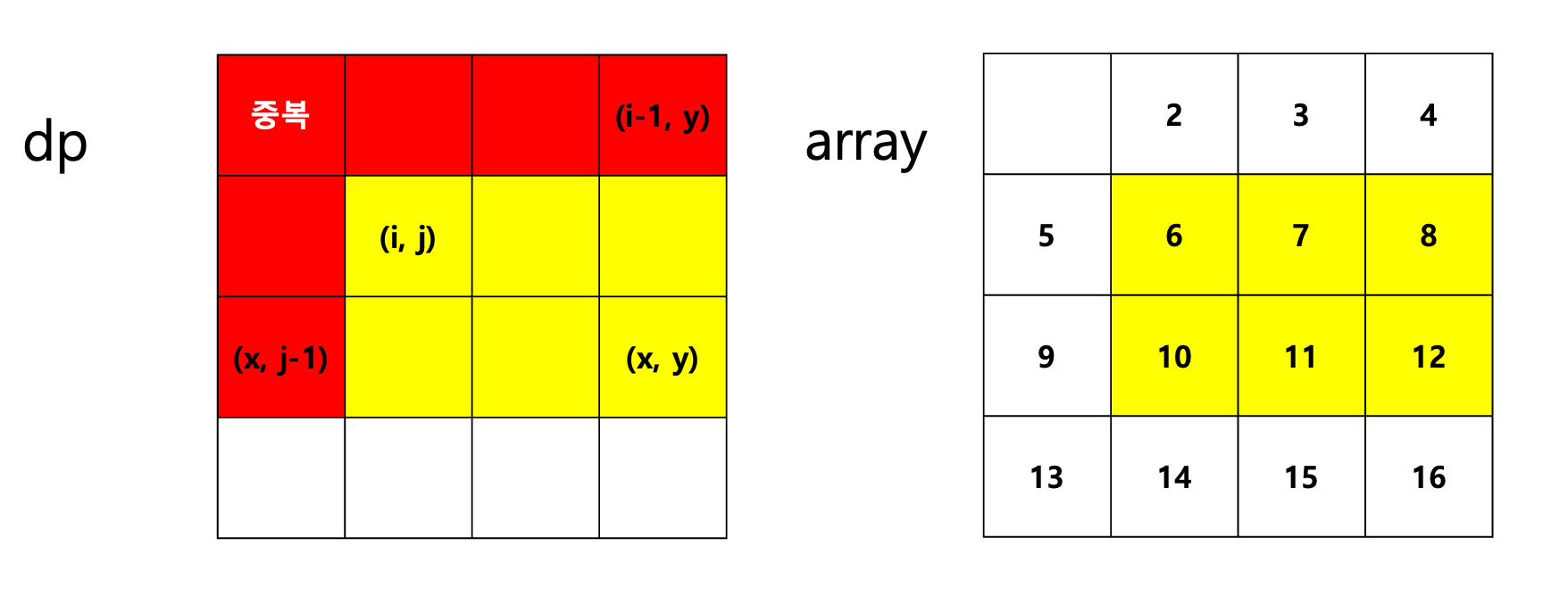 더하고 싶은 영역이 아닌 사각형 dp[x][j-1]와 dp[j-1][y]를 빼주어야 하는데