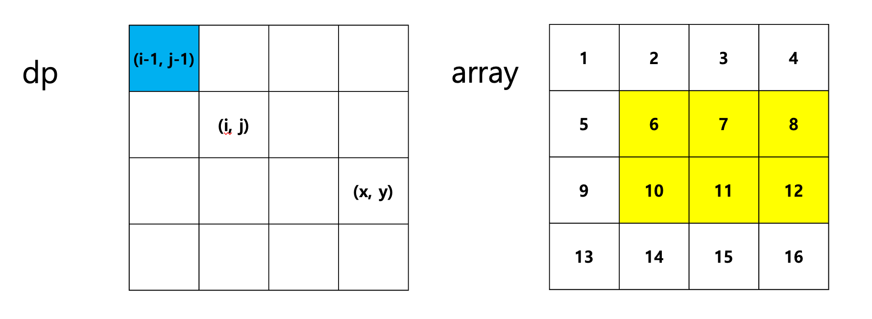 array[i][j] ~ array[x][y]까지의 합 = dp[x][y] - dp[i-1][y] - dp[x][j-1] + dp[i-1][j-1]
