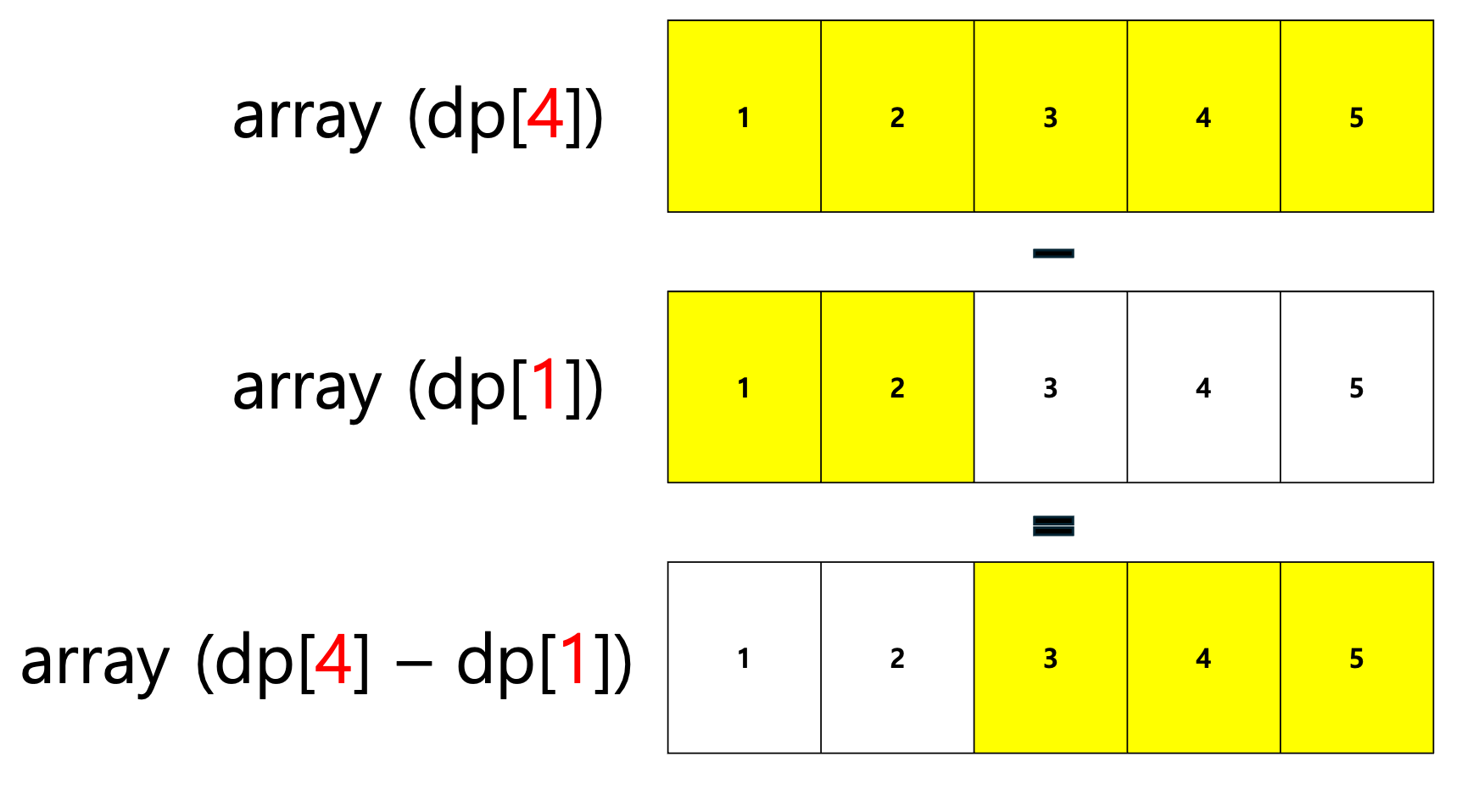 dp[4] - dp[1]을 해주면 array[2~4]까지의 합을 구할 수 있음.
