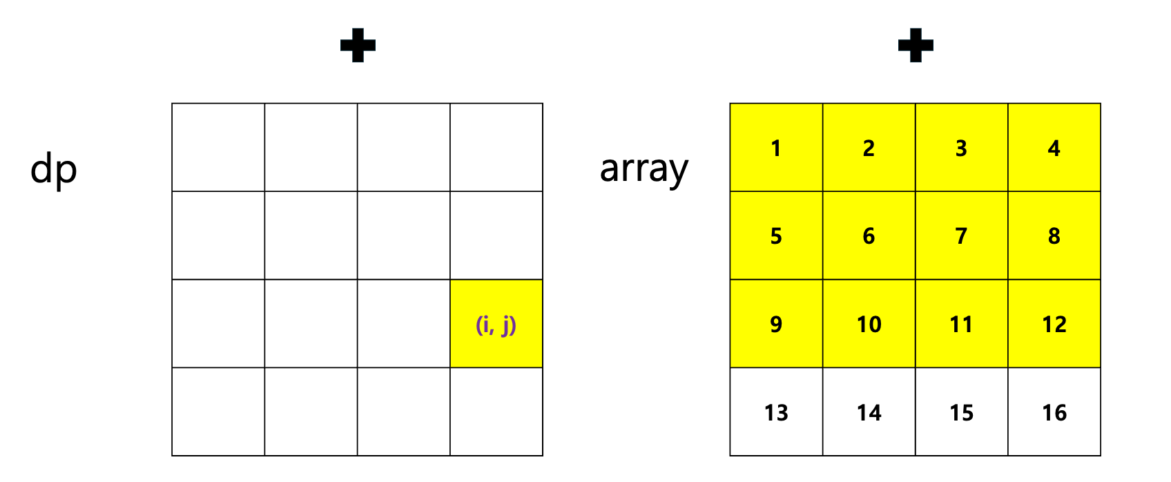 dp[1][1]은 array[0~1][0~1]까지의 값을 모두 더한 값 14가 되는 것임.