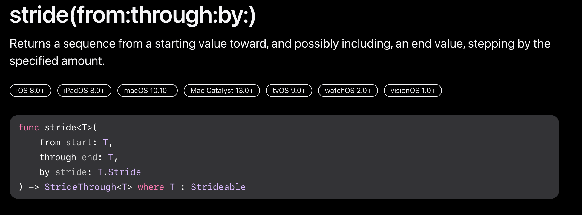 https://developer.apple.com/documentation/swift/stride(from:through:by:)