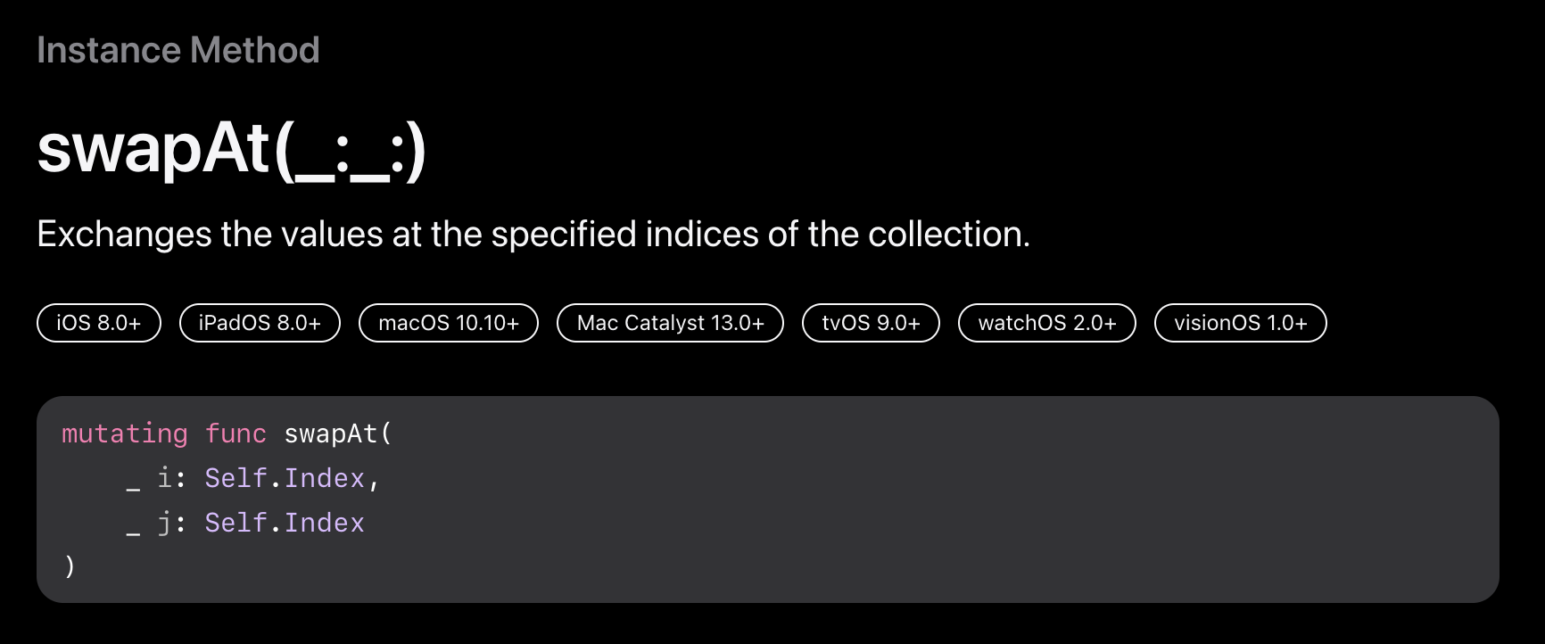 여러 가지 방법을 알아보다가 swapAt(_:_:)를 알게 됐었음!!