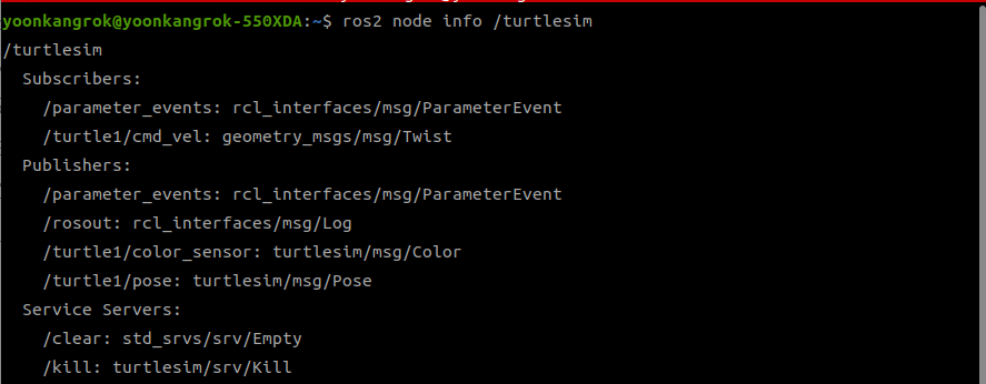 ros2 node info 명령어를 이용하여 turtlesim 노드의 토픽 정보를 확인해 보자!