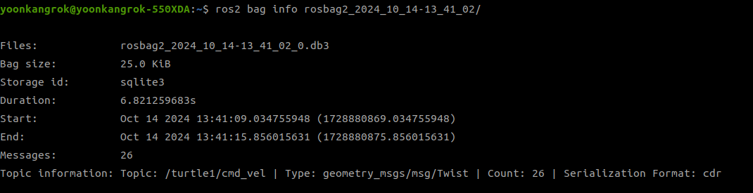기록이 종료되면 rosbag2_2024_10_14-13_41_02 폴더가 생성됨!