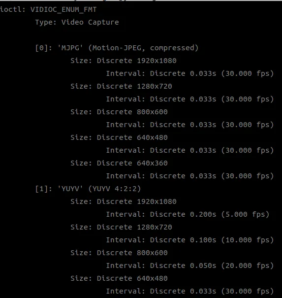 usb 카메라는 ‘MJPG’, ‘YUYV’ 2가지 포맷방식을 지원하고 각 포맷별로 여러 가지 출력 사이즈를 지원하고 있음.