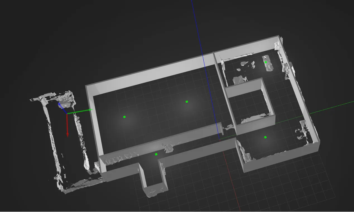여기서 맵을 보면 스캔이 잘 안 이루어져서 벽을 일일이 만들어 줬음. 물론, 어차피 벽을 세워서 공간을 다시 만들 거라면 "굳이 LiDAR로 스캔까지 해야 했을까?" 라는 의문이 들 수 있음. 그러나 전문 스캐너가 아닌 아이폰 LiDAR를 사용하다 보니 깨진 영역이 많고, 정밀한 맵 구성에는 어려움이 있었음.